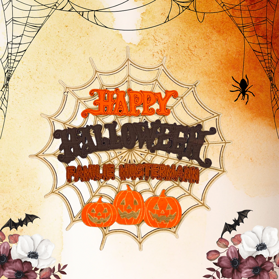 Für alle, die es stilvoll, langlebig und wetterfest mögen, ist unser Halloween Türschild aus Holz mit Spinnennetz-Design genau das Richtige. Es wird mit dem Schriftzug „Happy Halloween“, deinem Familiennamen und drei kleinen Kürbissen individuell graviert.